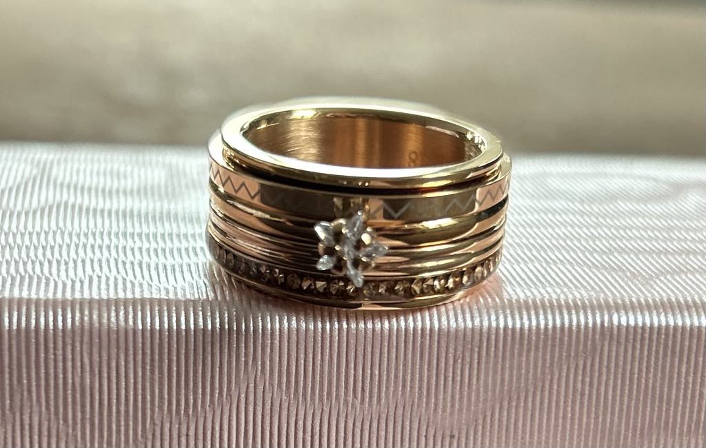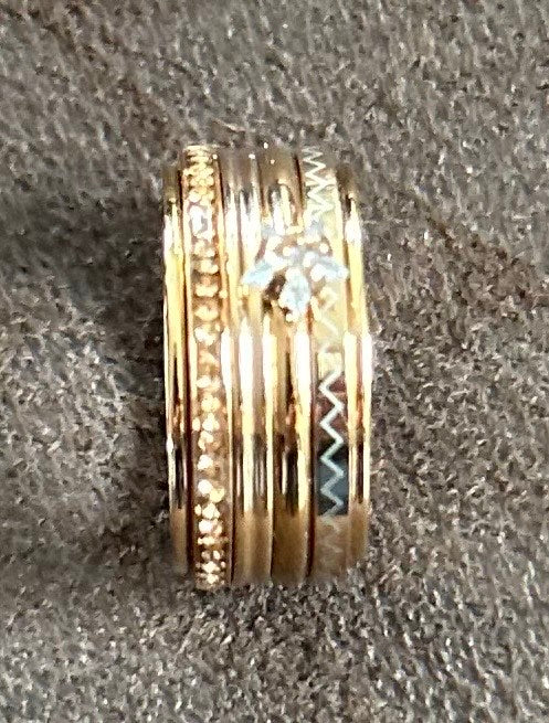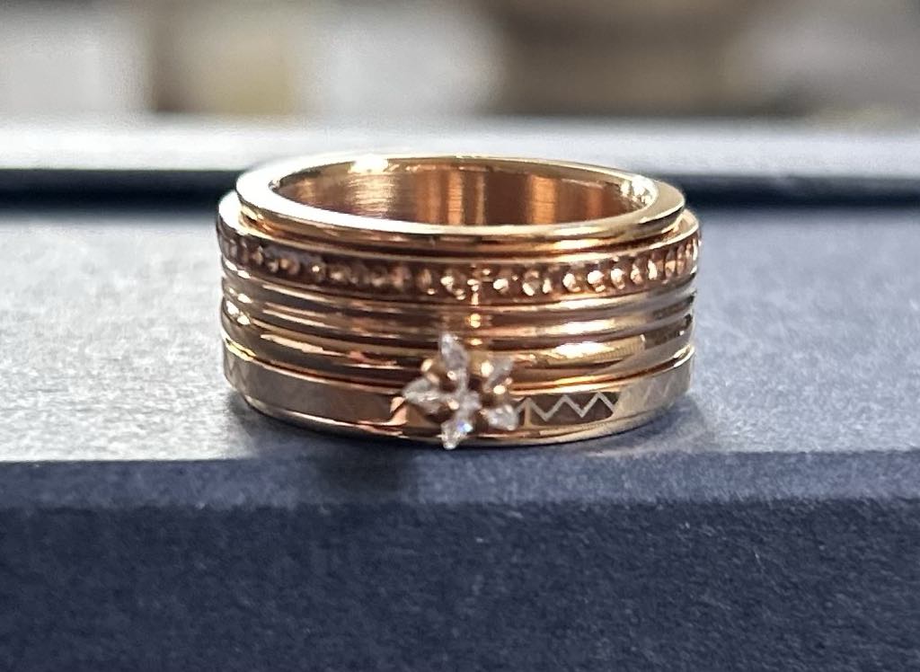 Cette bague est composée d’un anneau vierge or rose recouvert de 3 anneaux 2mm or rose décorés et d’un anneau 2mm avec une pierre étoile.