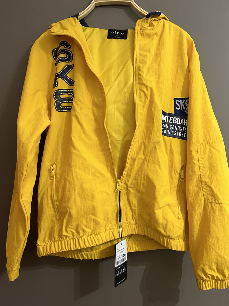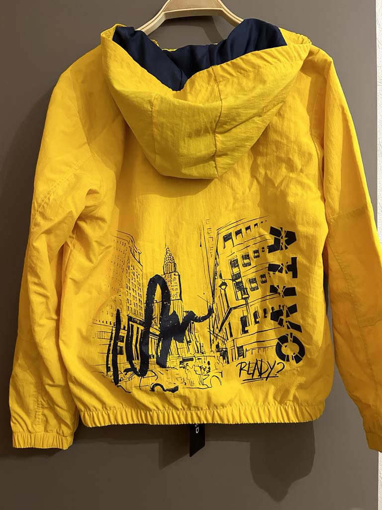 Jolie blouson à capuche jaune citron avec motifs et inscriptions marine. Cette jolie veste est très originale avec sa fresque sur l’arrière d’un quartier de ville . Fermeture du blouson et des 2 poches par fermetures éclairs.