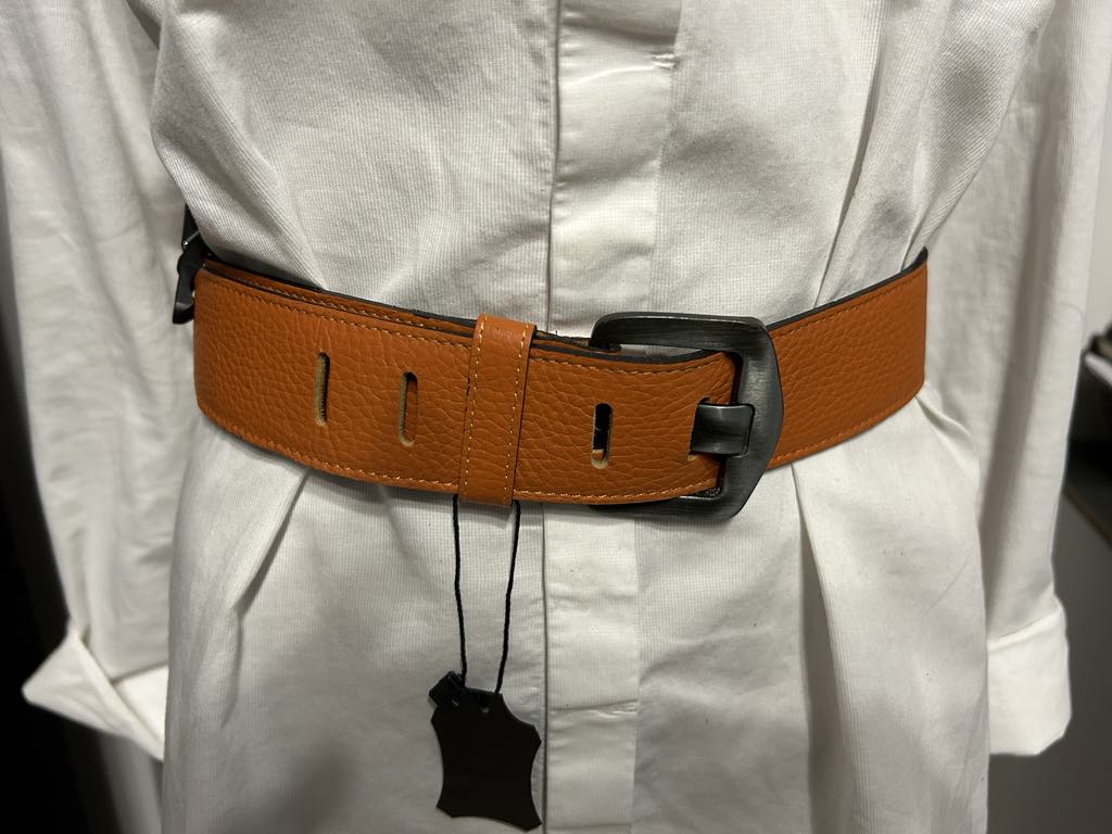 Ceinture en cuir orange, largeur 5 cm, boucle argent vieilli.