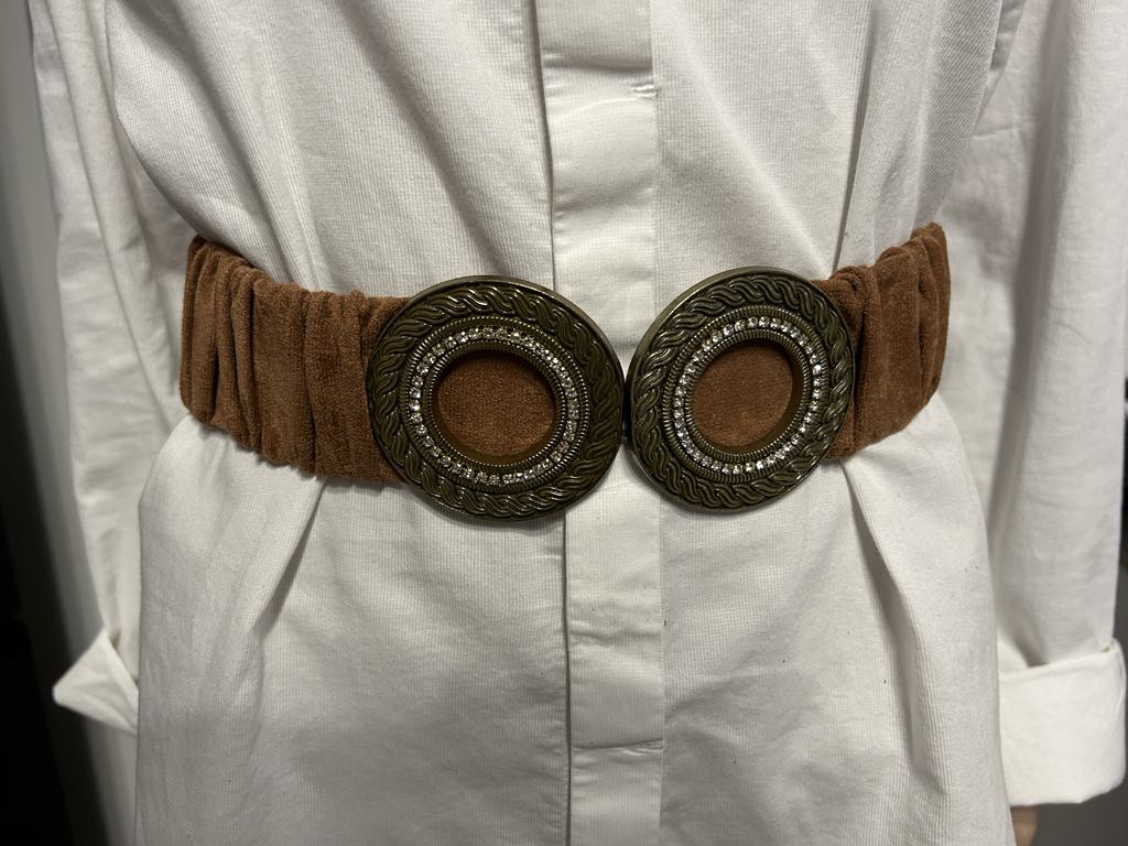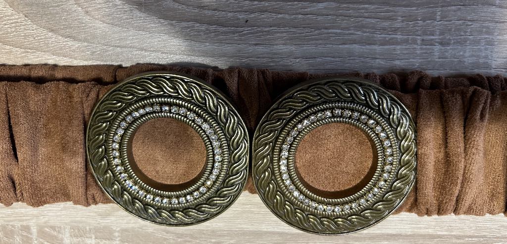 Cette ceinture en tissu élastique au coloris caramel et à la boucle en bijoux dorée allie confort et élégance. Son élasticité vous assure un ajustement parfait et sa boucle en bijoux ajoute une touche de sophistication à votre tenue. Idéale pour toutes les occasions, cette ceinture est un accessoire indispensable pour votre garde-robe.