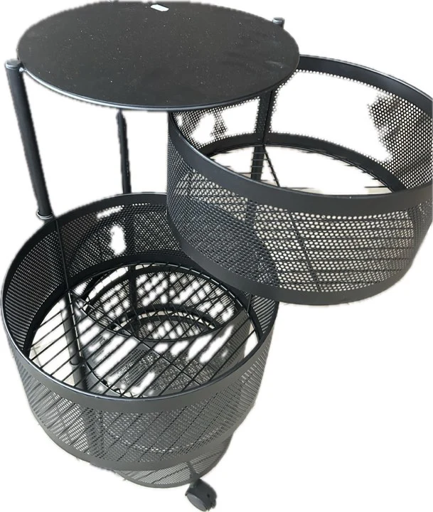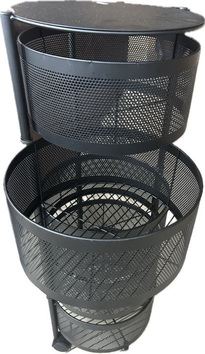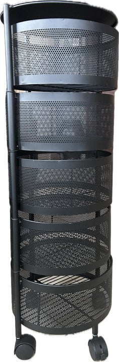Idéale pour ranger dans une cuisine , une salle de bain ..etc . Cette desserte est en métal ajouré noir. Elle possède des roulettes mais également 5 paniers de rangement. Sa hauteur est de 90 cm et son diamètre 31 cm.