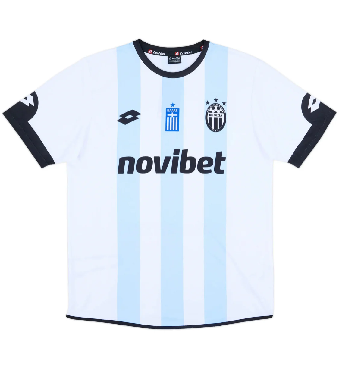 Notes : Une base blanche éclatante, animée de fines bandes verticales bleu ciel et noires, apporte un contraste moderne tout en restant fidèle à l’identité du club grec.