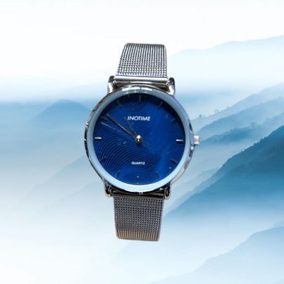 Montre quartz INOTIME cadran argenté fond bleu dur avec vagues aiguilles et chiffres noirs, bracelet métal maille fine Ref:913983