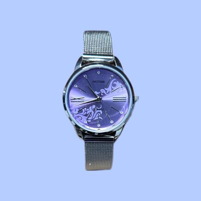 Montre INOTIME avec cadran rond argenté fond violet avec motifs, chiffres romains et 3 aiguilles argentées, bracelet métallique maille fine. Ref: 912909