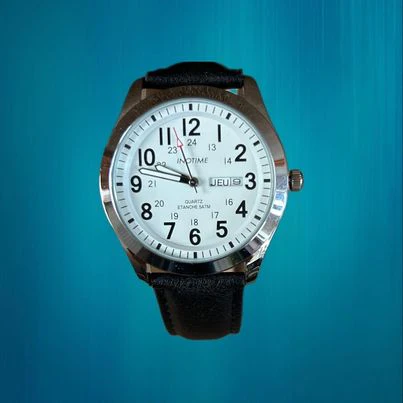 Montre homme INOTIME (962075) dotée d’un mouvement quartz à 3 aiguilles. Ce modèle est composé d’un boîtier rond en métal argenté de 42 mm de diamètre avec verre minéral, d’un cadran blanc gradué avec index et grands chiffres noirs et d’un bracelet en cuir noir avec boucle ardillon.