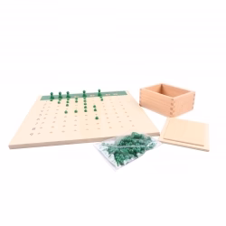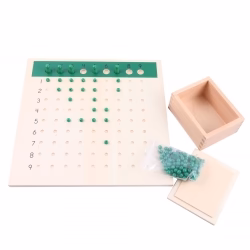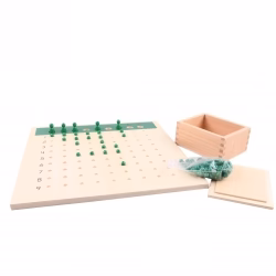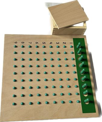- 1 tableau de 9 sur 9 en bois avec des trous : il y a la séquence de 1 à 9 en haut du tableau avec 9 trous qui représentent le diviseur, sur la gauche chaque ligne est numérotée de 1 à 9 et représente le quotient. Les 81 trous représentent le dividende.