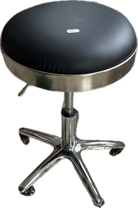 Joli tabouret en inox et simili cuir . Assise 33 cm. Il possède 5 roulettes et un réglage en hauteur. Ainsi au plus bas il fait 41cm et au plus haut 55 cm.